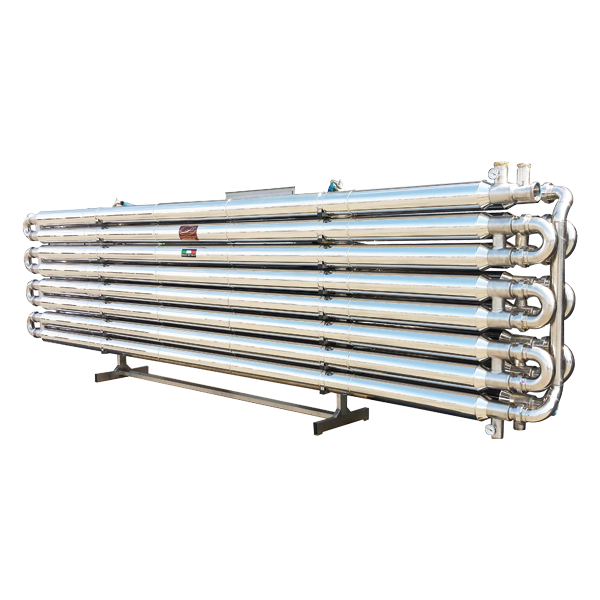 Теплообменники «труба в трубе» представляют собой модульные устройства, подходящие для нагрева/охлаждения продуктов, таких как сусло и фруктовые соки, как чистых, так и содержащих жмых или мякоть. Их форма обеспечивает легкий доступ к трубам, внутри которых протекает продукт, и, следовательно, быструю очистку теплообменника.